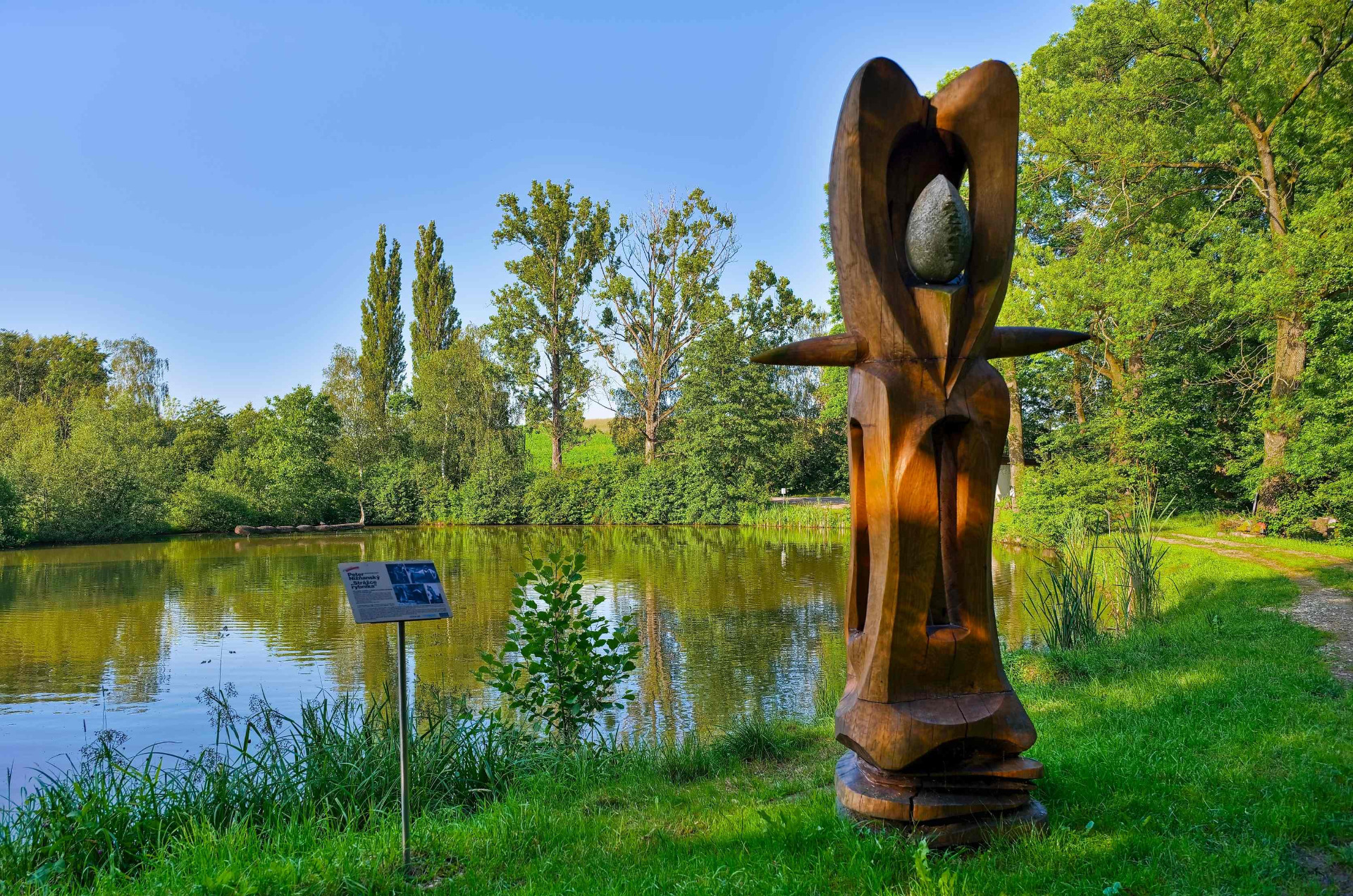 Na Galerijní rybník jsem narazil, při prohlížení map a hledání zajímavé vodní plochy vhodné pro rodinnou fotku v okolí Jistebníku. Rybníků je zde spoustu, ale ne mnoho jich má tak hezky upravené břehy a ještě navíc porostlé trávou, dřevěné sochy na kraji rybníku i v něm, jsou další příjemný bonus.